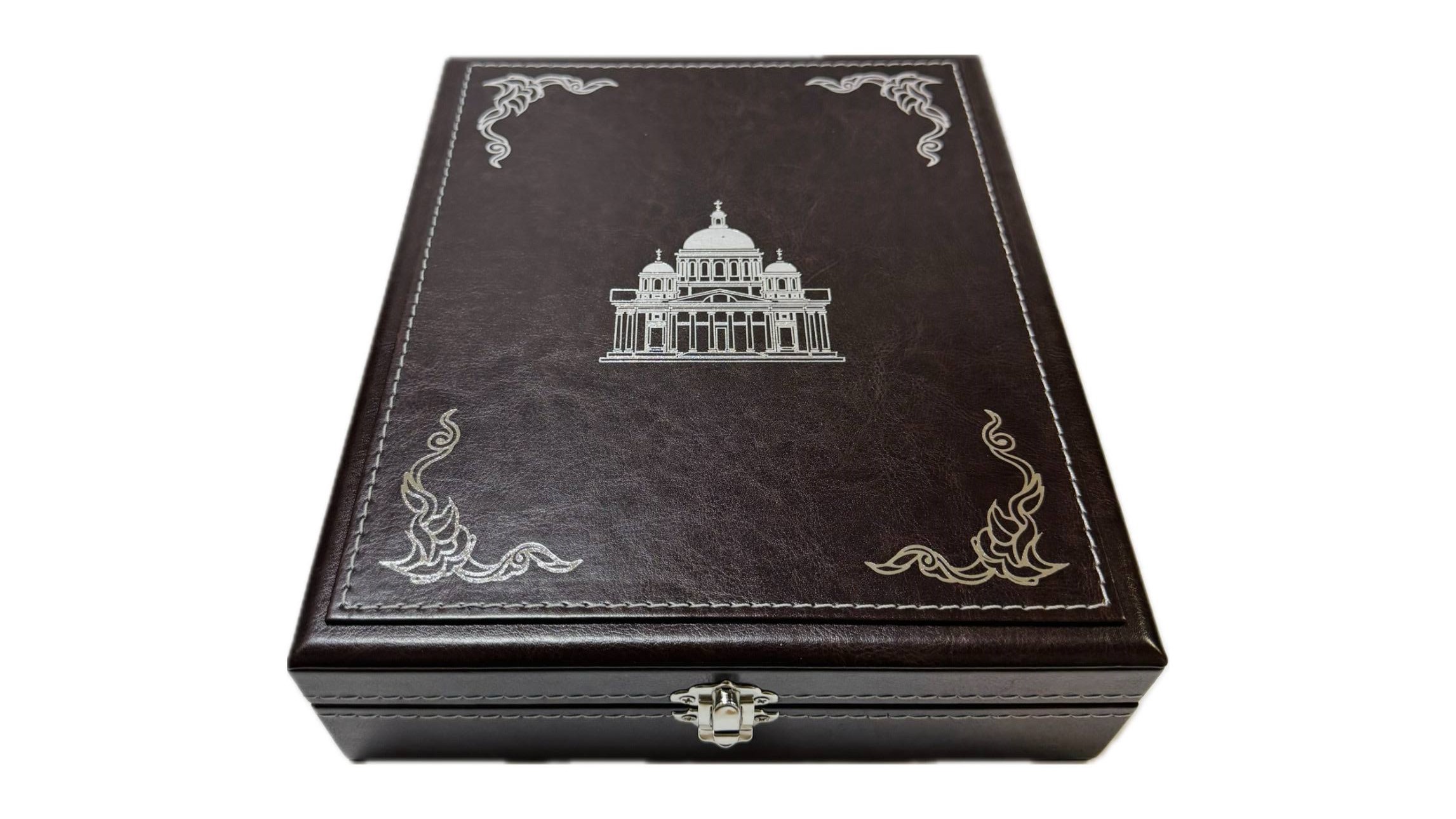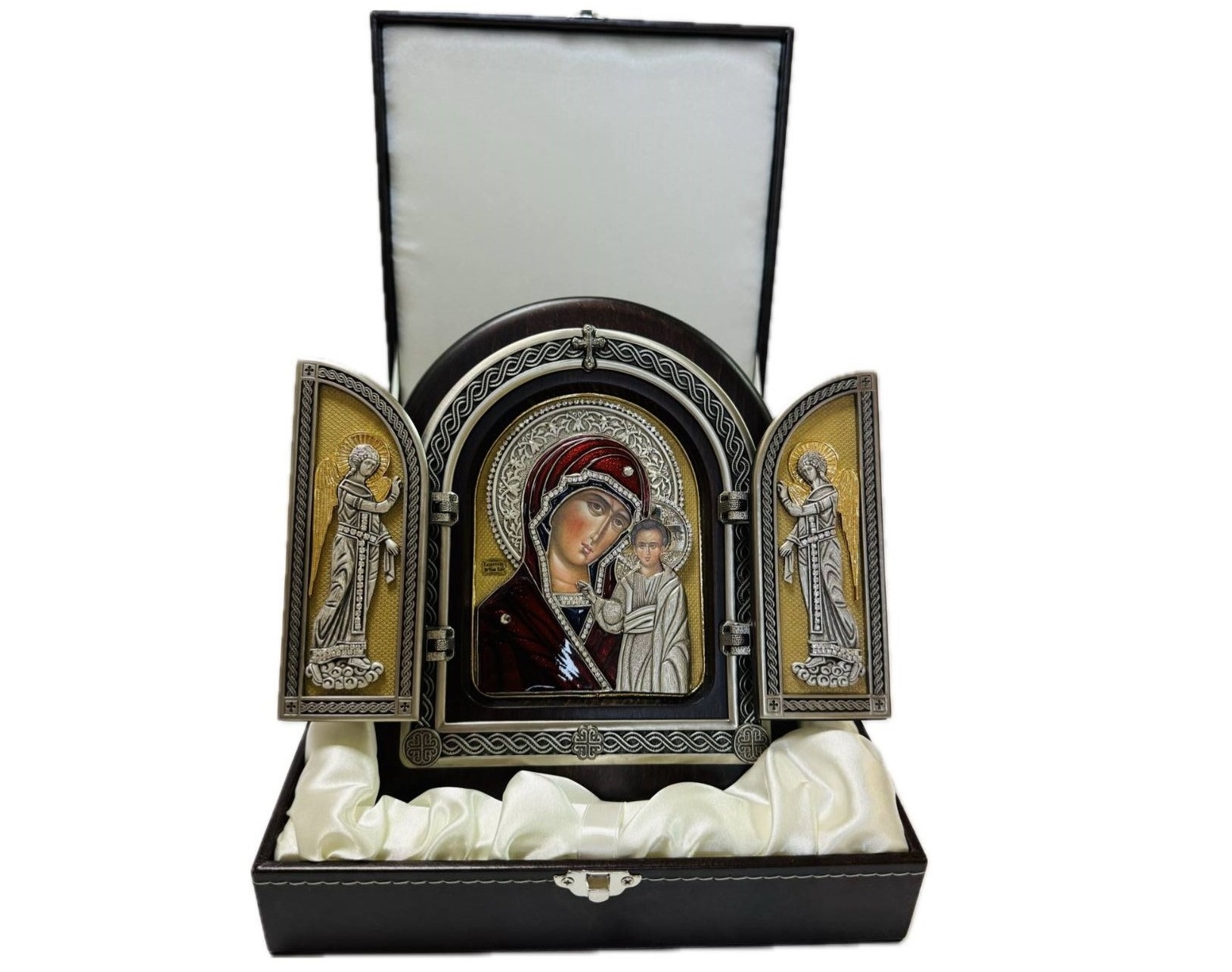 Икона укладывается в футляр из кожи коричневого цвета с изображением на крышке православного собора.Ложемент футляра покрыт белым шелком. Замок выполнен из металла "под серебро".