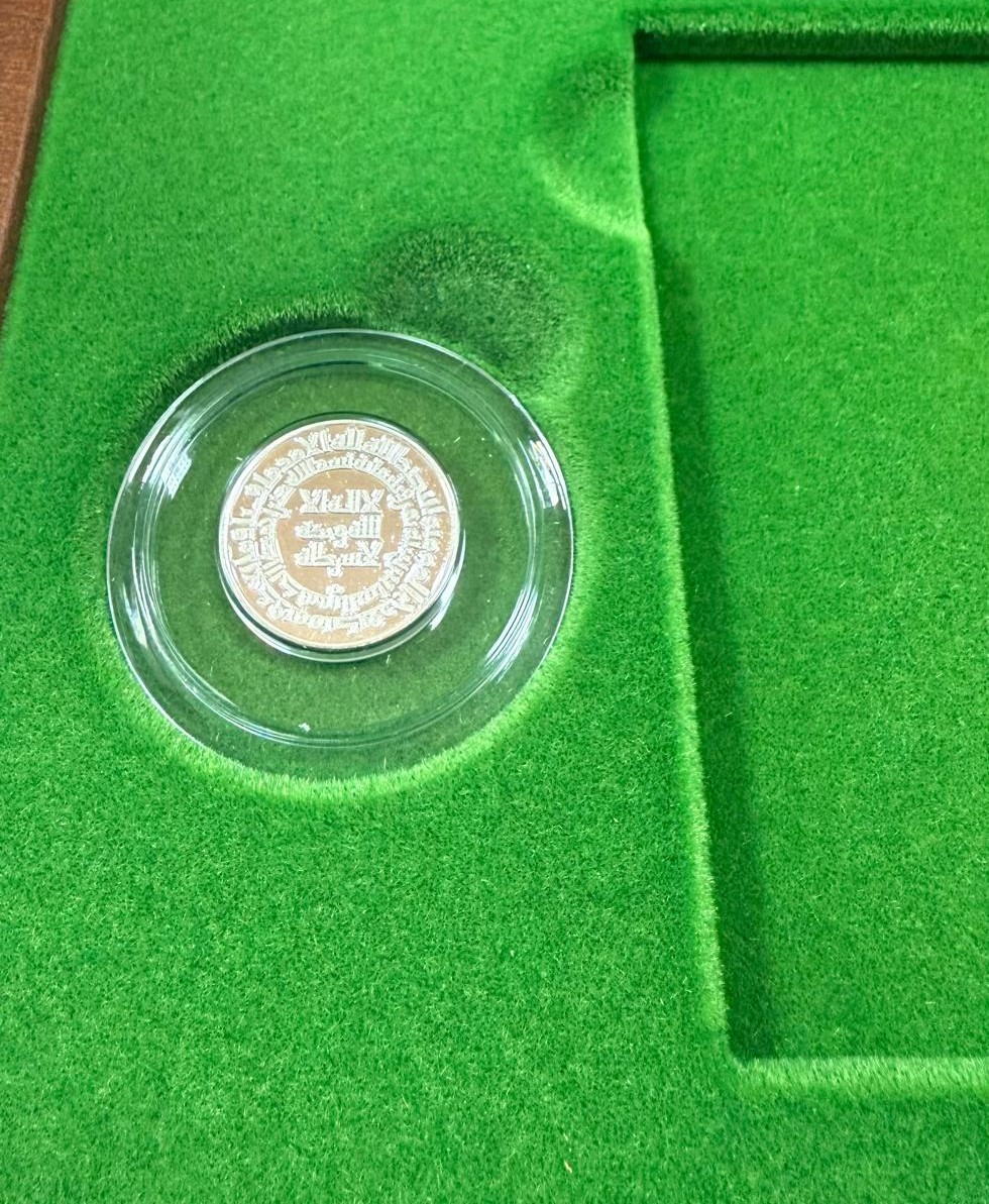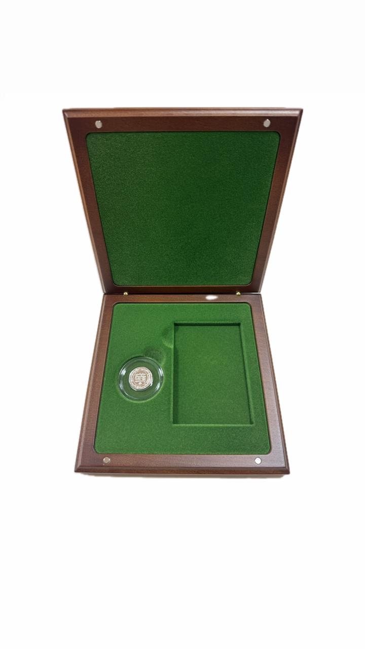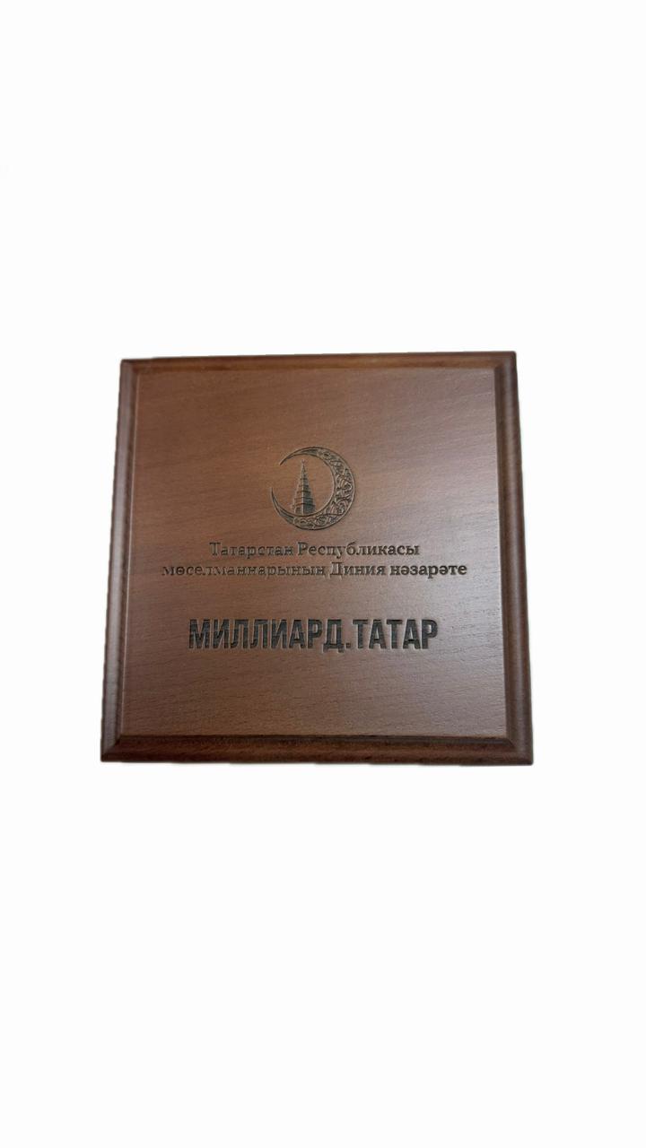 Памятная монета укладывается в футляр из натурального дерева. Внутри футляра - ложемент из зеленого бархата. На крышке футляра нанесен логотип Духовного Управления Мусульман РТ, надпись на татарском языке, а так же "МИЛЛИАРД.ТАТАР".