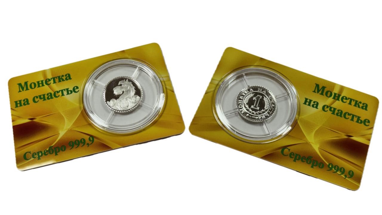 Монета диаметром 20 мм помещается в капсулу диаметром 44 мм., которая закреплена в ламинированную открытку с текстом "Монетка на счастье, Серебро 925" с двух сторон.