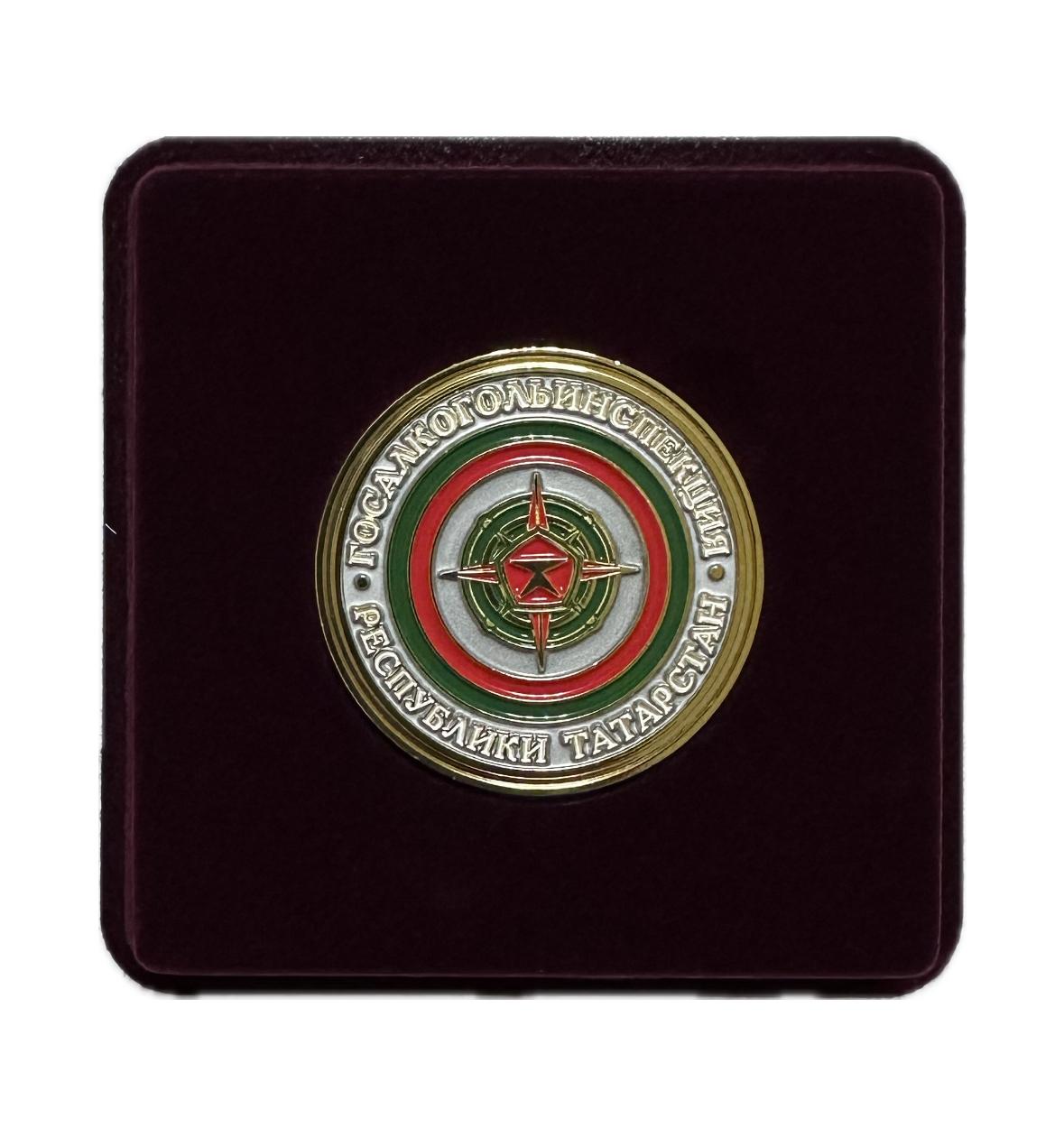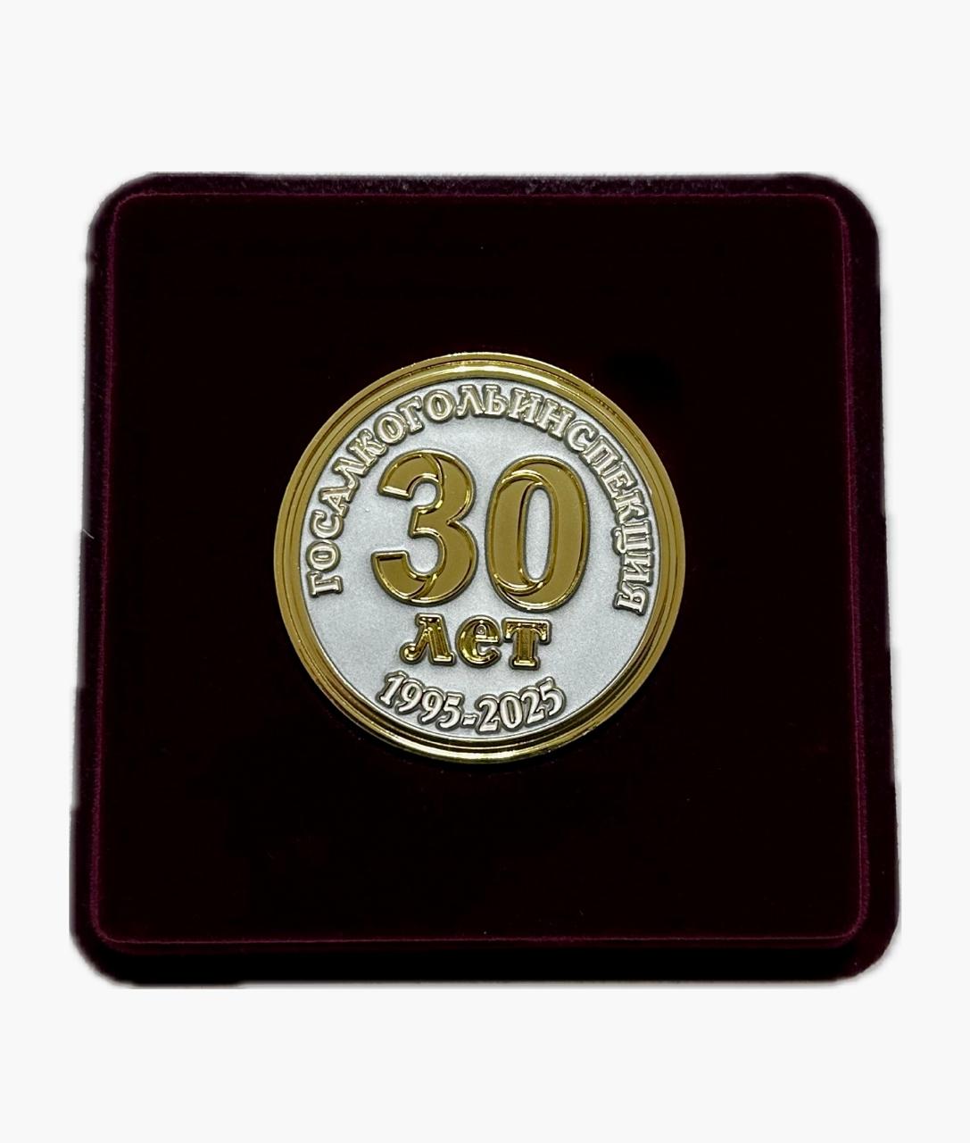Медаль выполнена из латуни с гальваническим покрытием под золото и цветными эмалями: серебристой, красной, зеленой и белой. Диаметр медали ф50 мм. С одной стороны в центре надпись "30 лет", а также по периметру "Госалкогольинспекция" и даты "1995-2025". С другой стороны в середине медали располагается знак в виде логотипа Госалкогольинспекции, в центре знак качества, далее по окружности залиты эмали в виде флага РТ, а по периметру медали идет надпись "Госалкогольинспекция • Республики Татарстан".