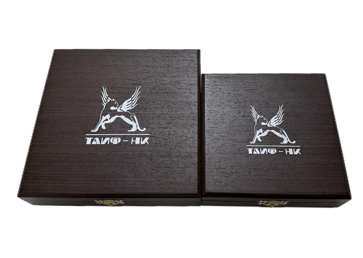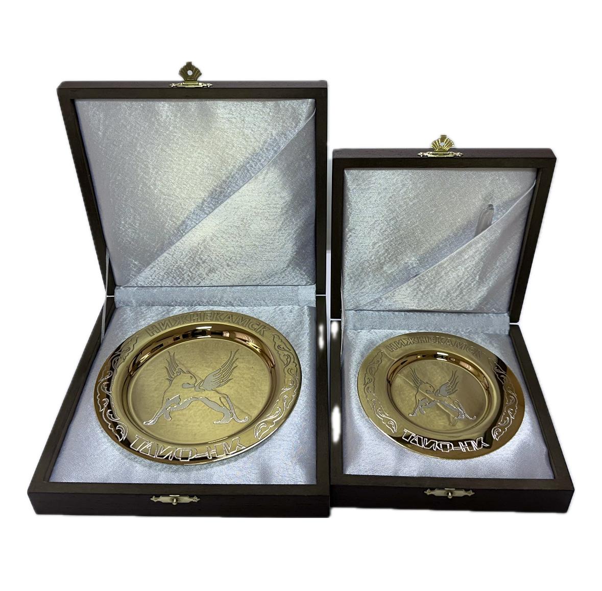 Тарелочка укладывается в футляр из дерева с тиснением логотипа ТАИФ-НК, замок-ракушка.