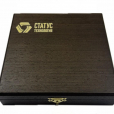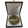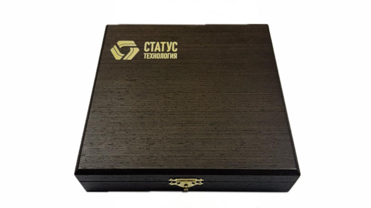 Тарелочка укладывается в футляр из дерева. На крышку нанесены логотип и название компании "Статус-технология". Ложемент футляра покрыт белым шелком. Замки для механического крепления крышки футляров выполнены из металла "под золото".