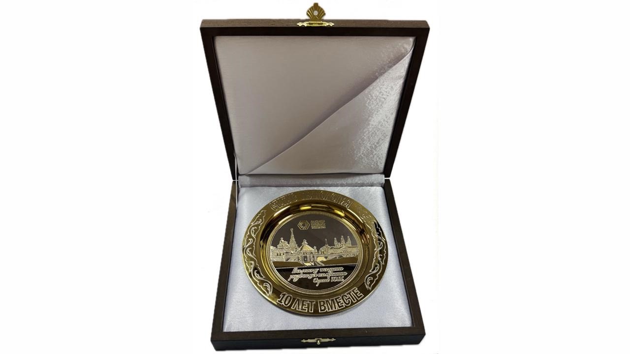 На тарелочке с помощью лазера изображена панорама Казанского Кремля, в верхней части нанесена надпись "Статус технология", в нижней надпись "Вы часть истории развития компании. Сергеев Ю.П."
