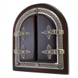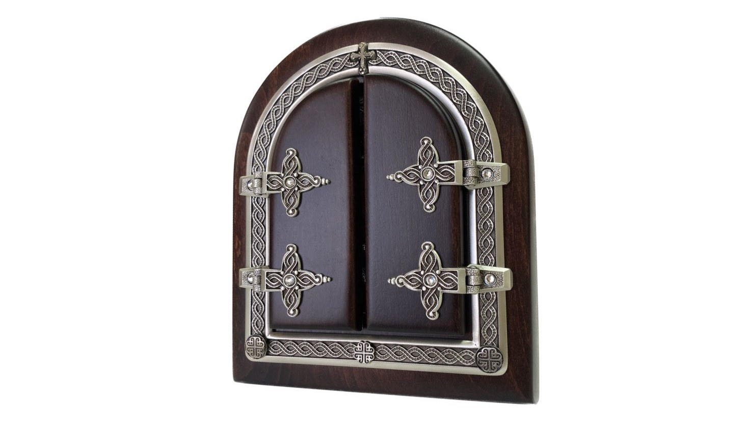 Икона укладывается в футляр из кожи коричневого цвета с изображением на крышке православного собора.Ложемент футляра покрыт белым шелком. Замок выполнен из металла "под серебро".