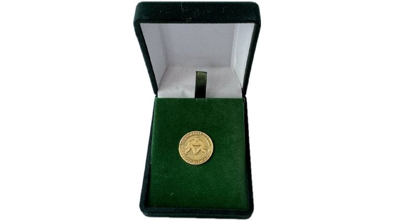 Нагрудный знак выполнен из серебра 925 пробы с покрытем золотом 999 пробы.