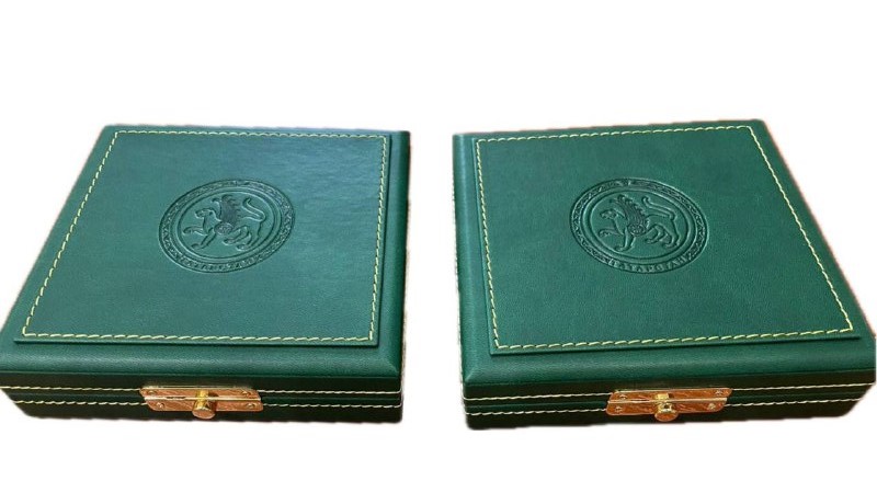 Медали укладываются футляр, обтянутый кожей зеленого цвета.На крышке футляра методом глубокого горячего тиснения нанесен Герб РТ.