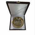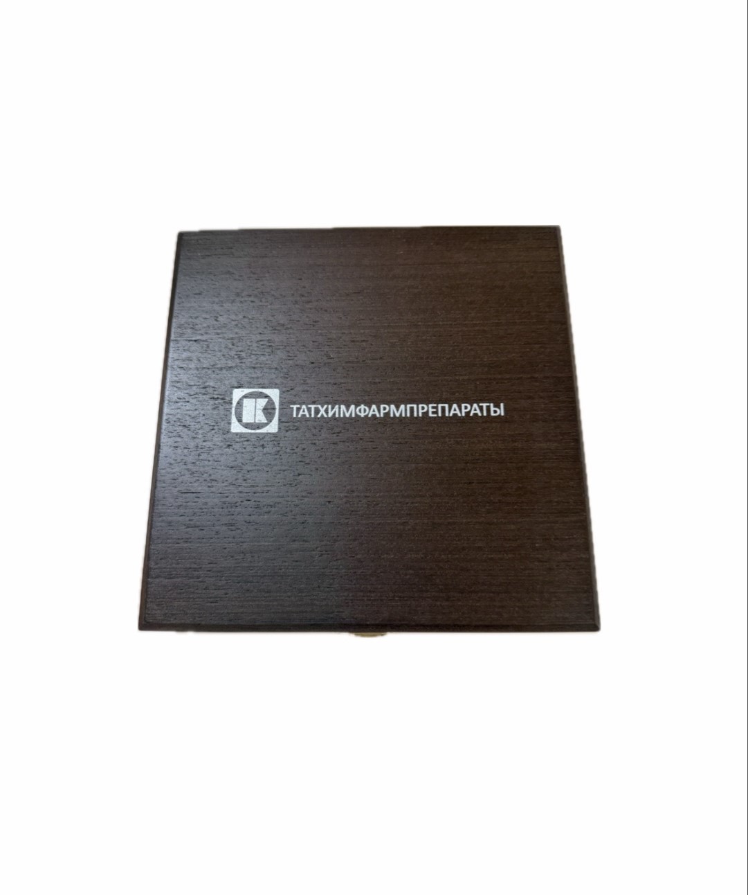 Тарелочка укладывается в футляр из дерева. На крышку нанесена надпись ТАТХИМФАРМПРЕПАРАТЫ . Ложемент футляра покрыт белым шелком. Замки для механического крепления крышки футляров выполнены из металла "под золото".