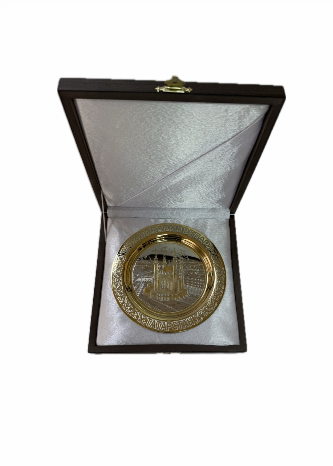 На тарелочке с помощью лазера и покрытий, изображена мечеть "Кул Шариф", сверху по краю тарелочки надпись ТАТХИМФАРМПРЕПАРАТЫ, а снизу нанесена надпись ТАТАРСТАН.