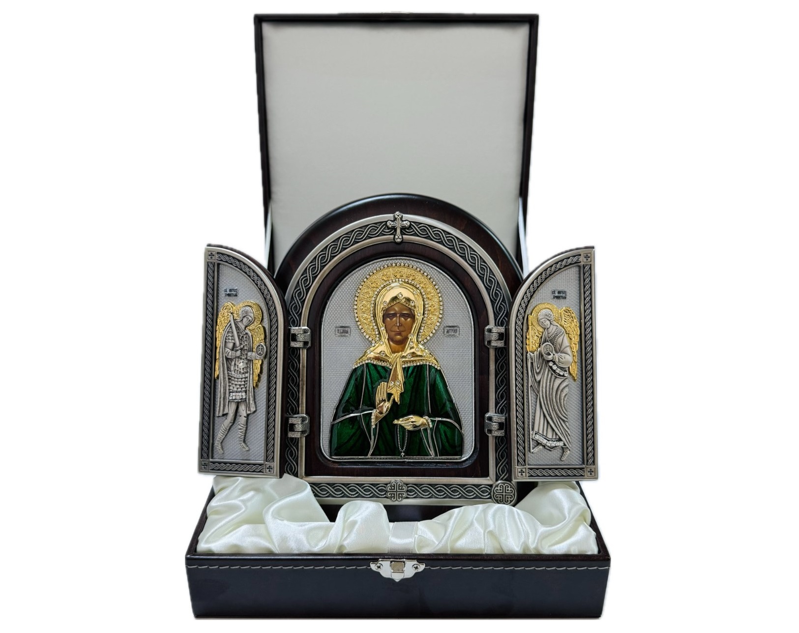 Икона укладывается в футляр из кожи коричневого цвета с изображением на крышке православного собора.Ложемент футляра покрыт белым шелком. Замок выполнен из металла "под серебро".