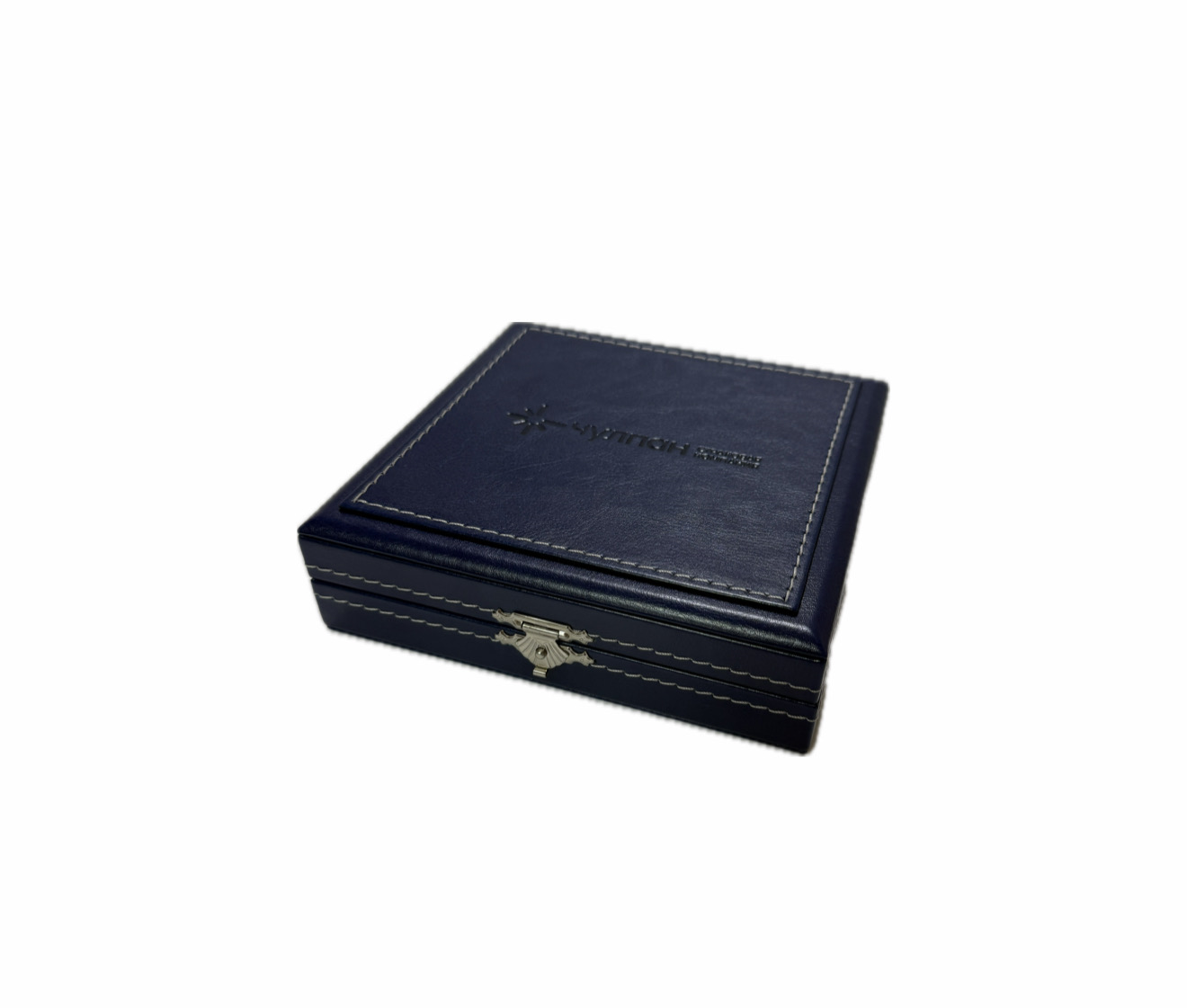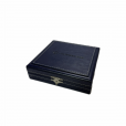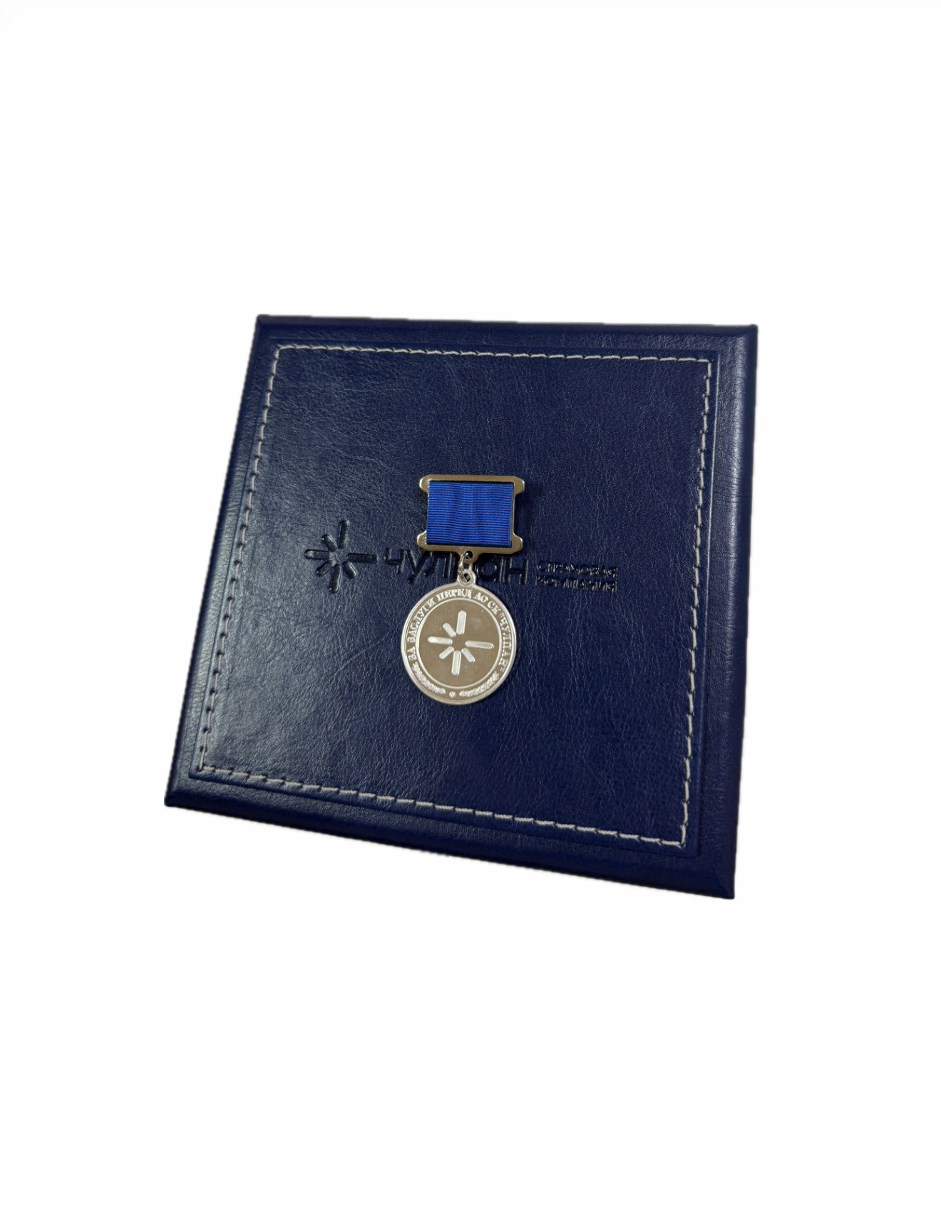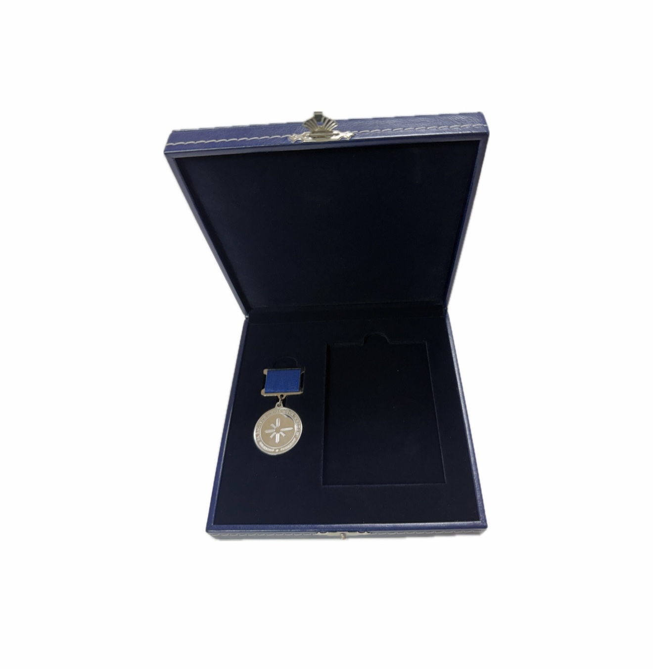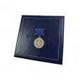 Медаль укладываются в футляр, обтянутый кожей темно-синего цвета. На крышке футляра горячим объемным тиснением нанесен логотип компании. В футляре так же предусмотрен справа ложемент под удостоверение