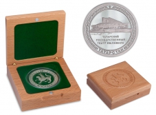 Медаль уложена в футляр из зеленого эфалина с серебряным тиснением герба РТ на крышке.