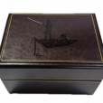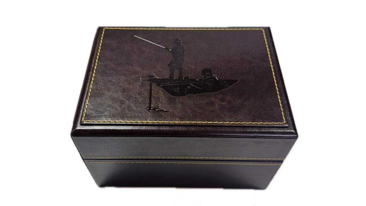 Бокал уложен в футляр, который выполнен из тросника болотного цвета с глубоким горячим тиснением "Рыбак в лодке". Ложемент футляра покрыт белым шелком.