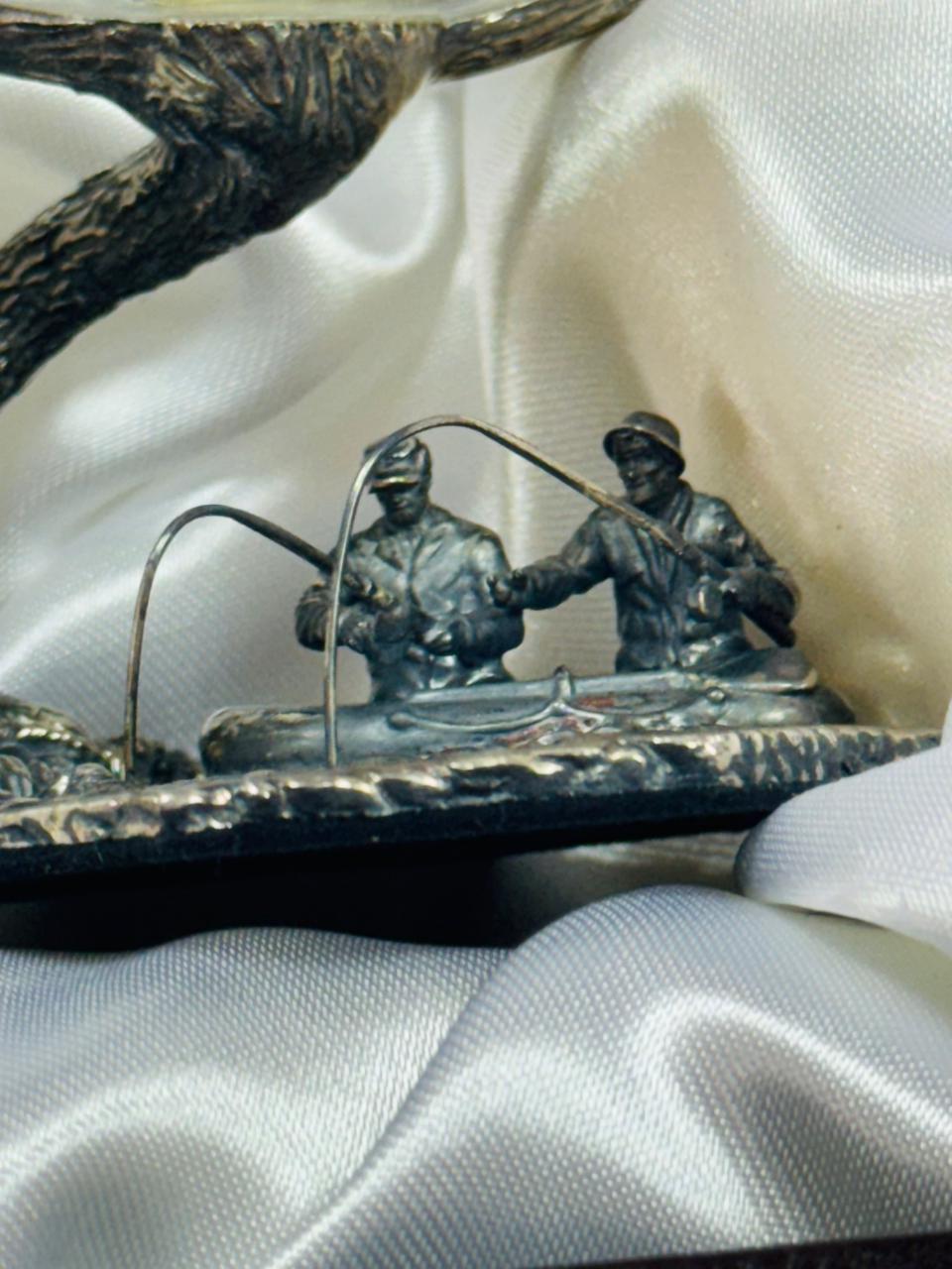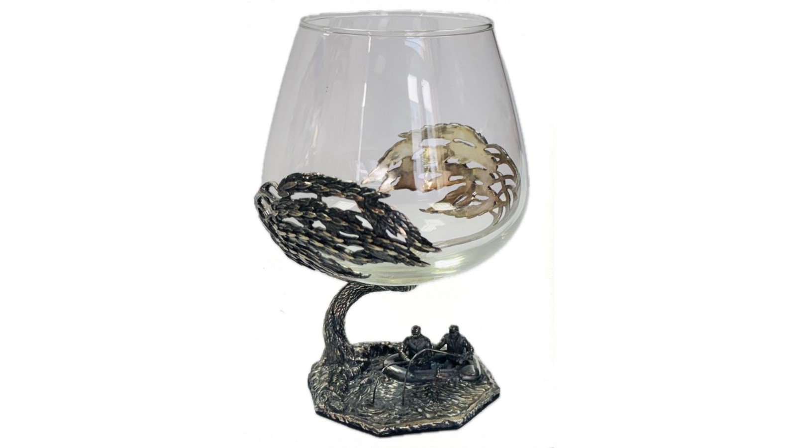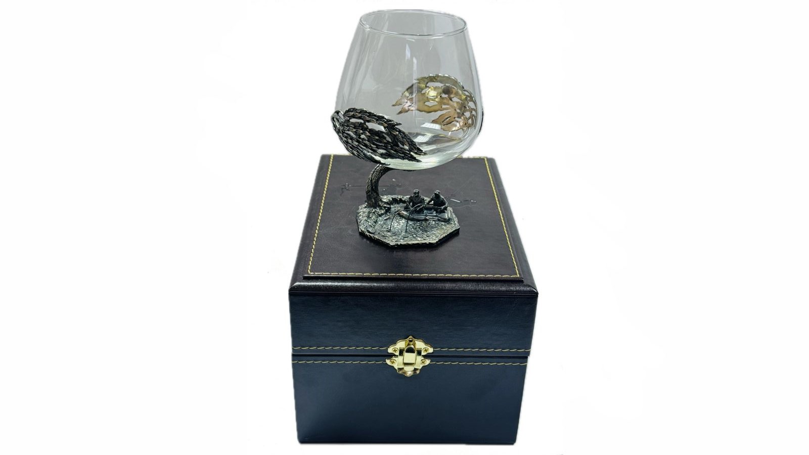 На бокале с детальной точностью изобразили сюжет рыбалки. Стеклянный бокал украшен рельефным рисунком из серебра, который создаёт на чаше растительный узор. Подставка бокала изготовлена в виде выразительной скульптурной композиции. Дерево, возле которого расположились рыбаки, поддерживает своей кроной часть бокала. Ножка фужера изготовлена методом точного художественного литья.