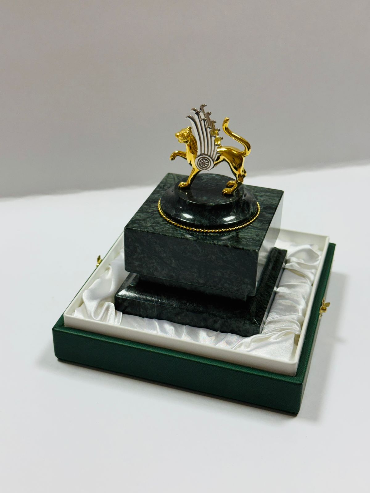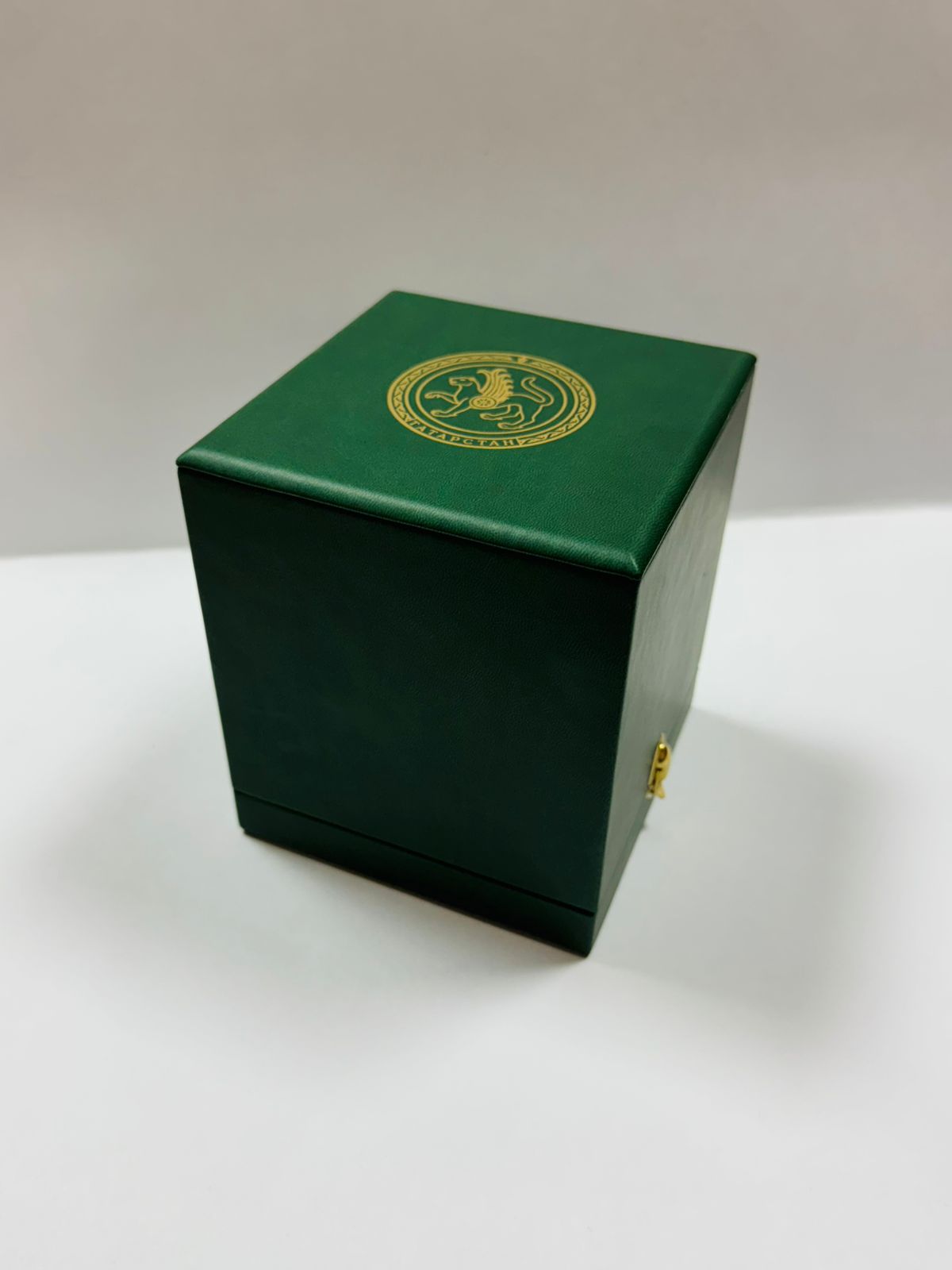 Футляр выполнен из кожи зеленого цвета. Ложемент футляра покрыт белым шелком. На крышке "золотым" тиснением изображен Герб РТ. Замки для механического крепления крышки футляра выполнены из металла "под золото".